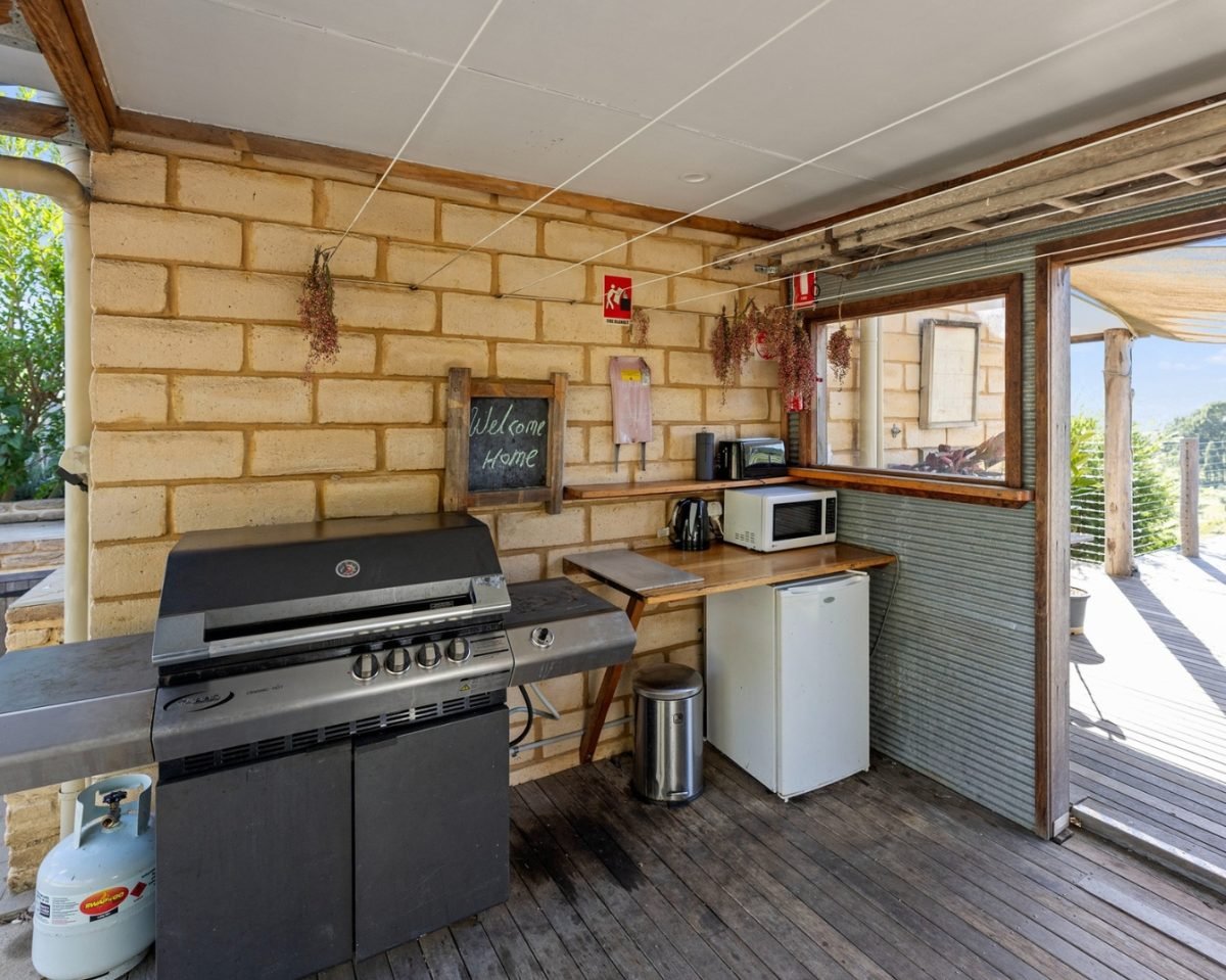 Open-air kitchen with BBQ & wood-fire pizza oven, fully equipped for a feast. Each room has a bar fridge, plus a shared pantry with tea, coffee, microwave & kettle.